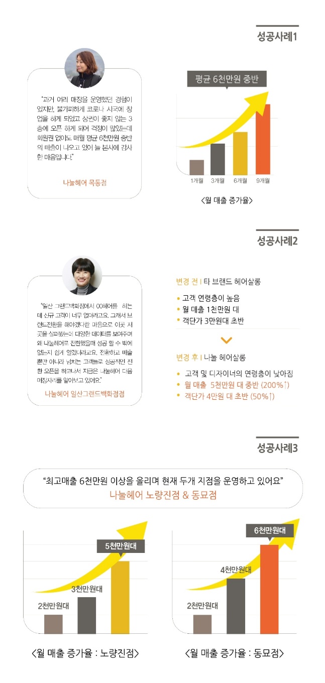 나눌 헤어의 대표적인 성공사례는 일산 그랜드백화점이다. 이곳은 기존에 타 브랜드 미용실이었으나, 적자가 누적되면서 브랜드를 변경하게 되었고 그 결과 객단가가 상승과 더불어 신규 고객이 월 250~300명 유입되며 월 매출이 약 3배 정도 증가해 5천만 원 후반을 유지하고 있다. 사업의 확신을 가지게 된 나눌 헤어 일산 그랜드백화점 원장은 불과 1호점 오픈 후 1년 만에 인근 웨스턴돔 지역에 영업이 어려워진 미용실을 인수해 2호점을 오픈하며 하루하루 새로운 희망을 키워가고 있다.